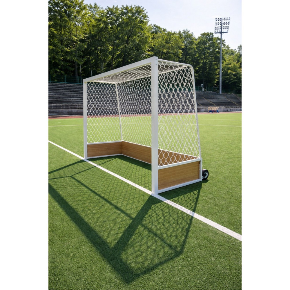 Конструкция выполнена из усиленного стального профиля, что гарантирует долговечность при интенсивных нагрузках. Для удобства перемещения массивных ворот по газону предусмотрены встроенные транспортировочные колеса, а нижняя часть створа надежно защищена от ударов.